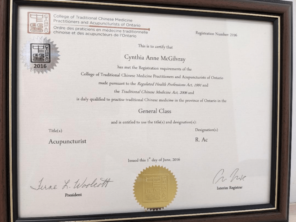 Cynthia is a Registered Acupuncturist in good standing with the College of Traditional Chinese Medicine Practitioners and Acupuncturists of Ontario. She graduated from the Institute of Traditional Medicine (ITM) in Toronto with a Diploma of Acupuncture. Her clinical training included ITM’s Pain and Stress Clinic, Women’s Clinic, National Acupuncture Detoxification Association (NADA) training, the off-site PWA (Persons With AIDS) clinic in downtown Toronto, as well as an internship at a community acupuncture clinic.
